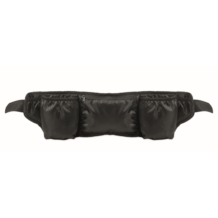 Sportovní ledvinka na běhání a turistiku vyrobená z polyesteru 420D RPET se síťovanými zády. Má dvě přihrádky na lahve, centrální kapsu na zip a nastavitelný popruh. Lehká a odolná. Rozměry: 47 x 13 cm