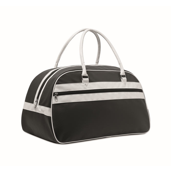 Sportovní taška z PU. Vnitřní podšívka, hlavní přihrádka a kapsa na zip, pevná ucha s cvočky a vsadka na dně. Objem cca 21,5 litru. Rozměry: 48 x 25 x 28 cm