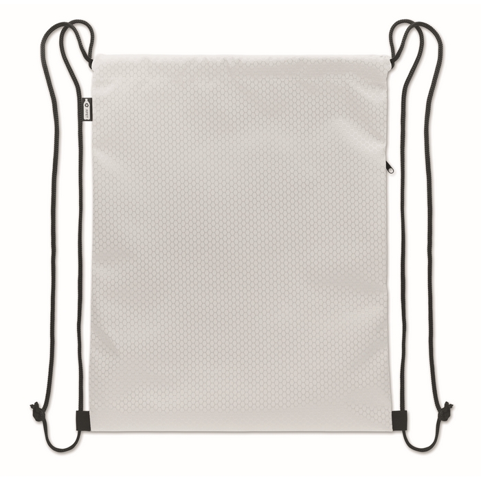 Stahovací batoh z polyesteru RPET 420D s vertikální boční kapsou na zip a podšívkou z materiálu RPET 210D. Pevné šňůrky, objem 4,5 l, maximální nosnost 5 kg. Rozměry: 34 x 42 cm