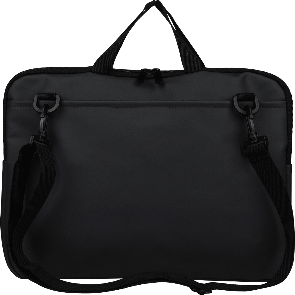 Brašna na notebook z recyklovaného PU pro zařízení do 15 palců se 4mm polstrováním a podšívkou z recyklovaného materiálu 210D. Má přední kapsu na zip, zadní kapsu na suchý zip, dvě krátká ucha, nastavitelný ramenní popruh a malé recyklované logo na vnitřním štítku. Rozměry: 28 cm x 40 cm