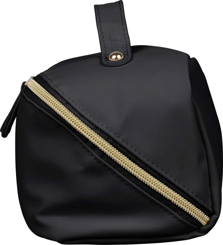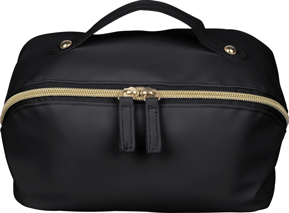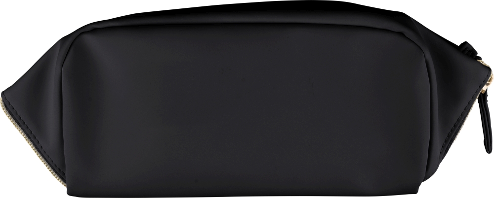 Toaletní taška z recyklovaného PU s centrálním zipem pro široké otevírání. Má krátké ucho, prostorný interiér se čtyřmi přihrádkami, včetně jedné vnitřní kapsy na zip. Podšívka z recyklovaného materiálu 210D a uvnitř jeden recyklovaný štítek. Rozměry: 12 cm x 22 cm
