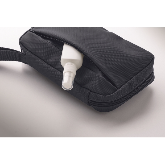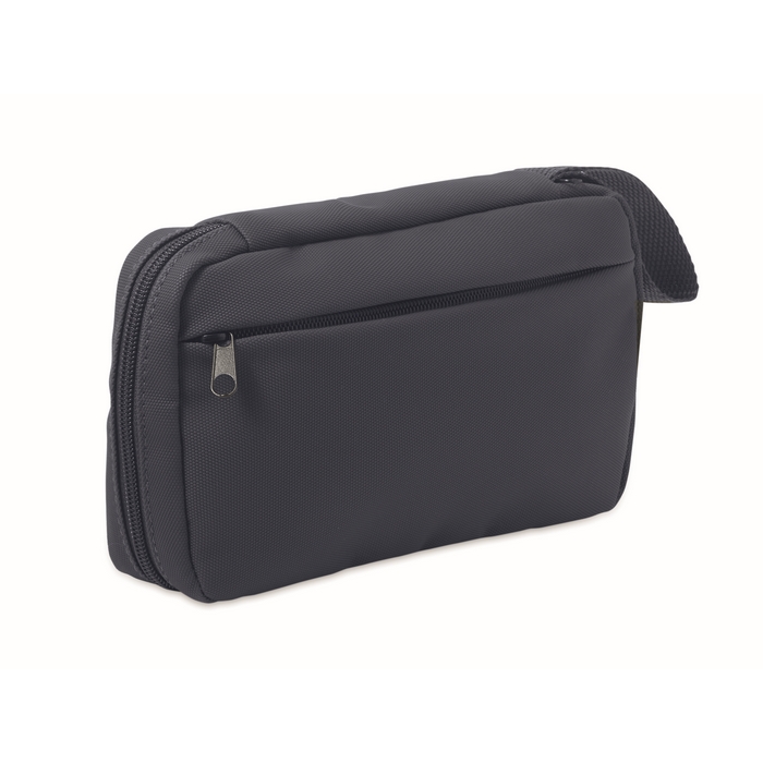 Toaletní taštička z 600D RPET s PU zátěrem, síťovinou RPET a podšívkou 210D RPET. Hlavní kapsa na zip vpředu, vnitřní síťovina a otevřené kapsy. Rozměry: 22 x 4 x 13 cm