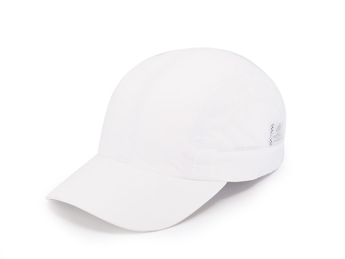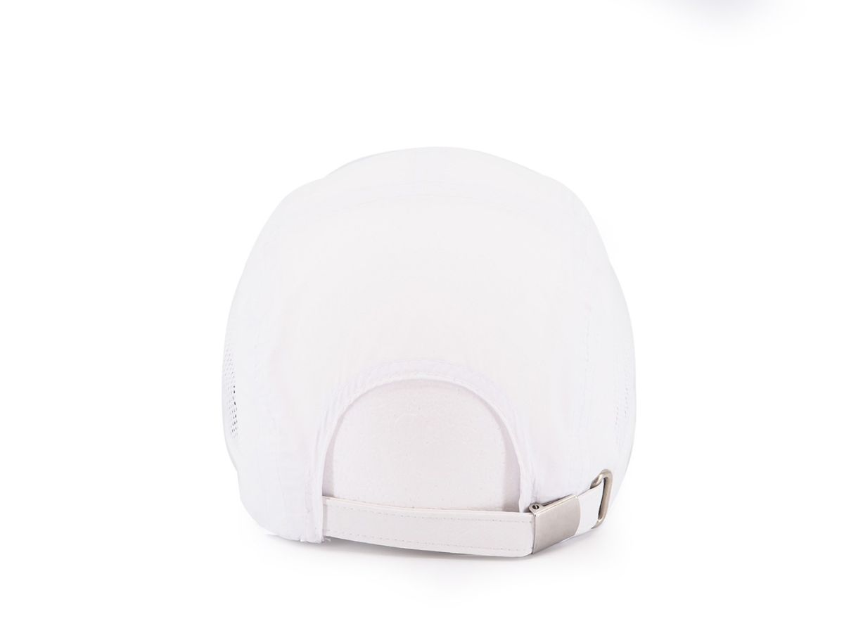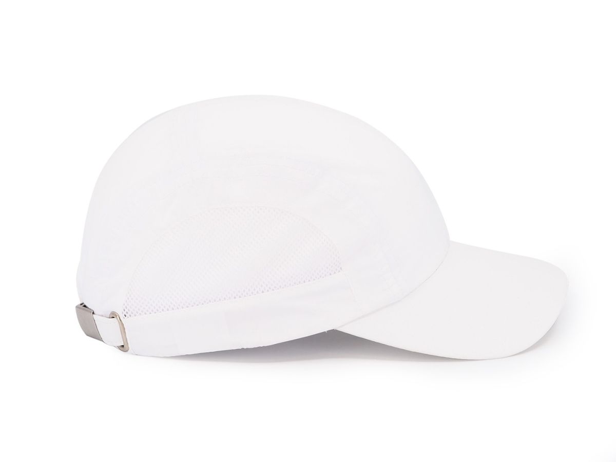 Vzdušná lehká čepice vhodná na sporty, zapínání na kovovou přezku, potící pásek a vnitřní lem, polyester.
