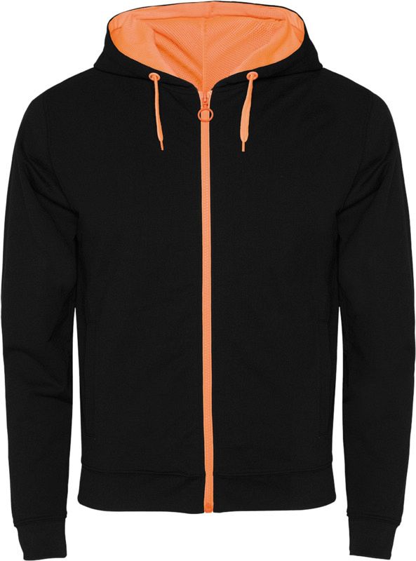 Mikina z nečesaného fleecu se zářivě barevnými detaily. Středový zip s kontrastním táhlem. Kapuce s podšívkou z mikroperforované polyesterové látky v kontrastní zářivé barvě. Stahovací šňůrka a kovová očka v kontrastní zářivé barvě. 1 × 1 žebrované manžety a pas. Dvě přední kapsy s širokým lemem. Zesílené kryté švy na vnitřním límci. Odnímatelný štítek. 60% Bavlna, 40% Polyester, 280 g/m2.