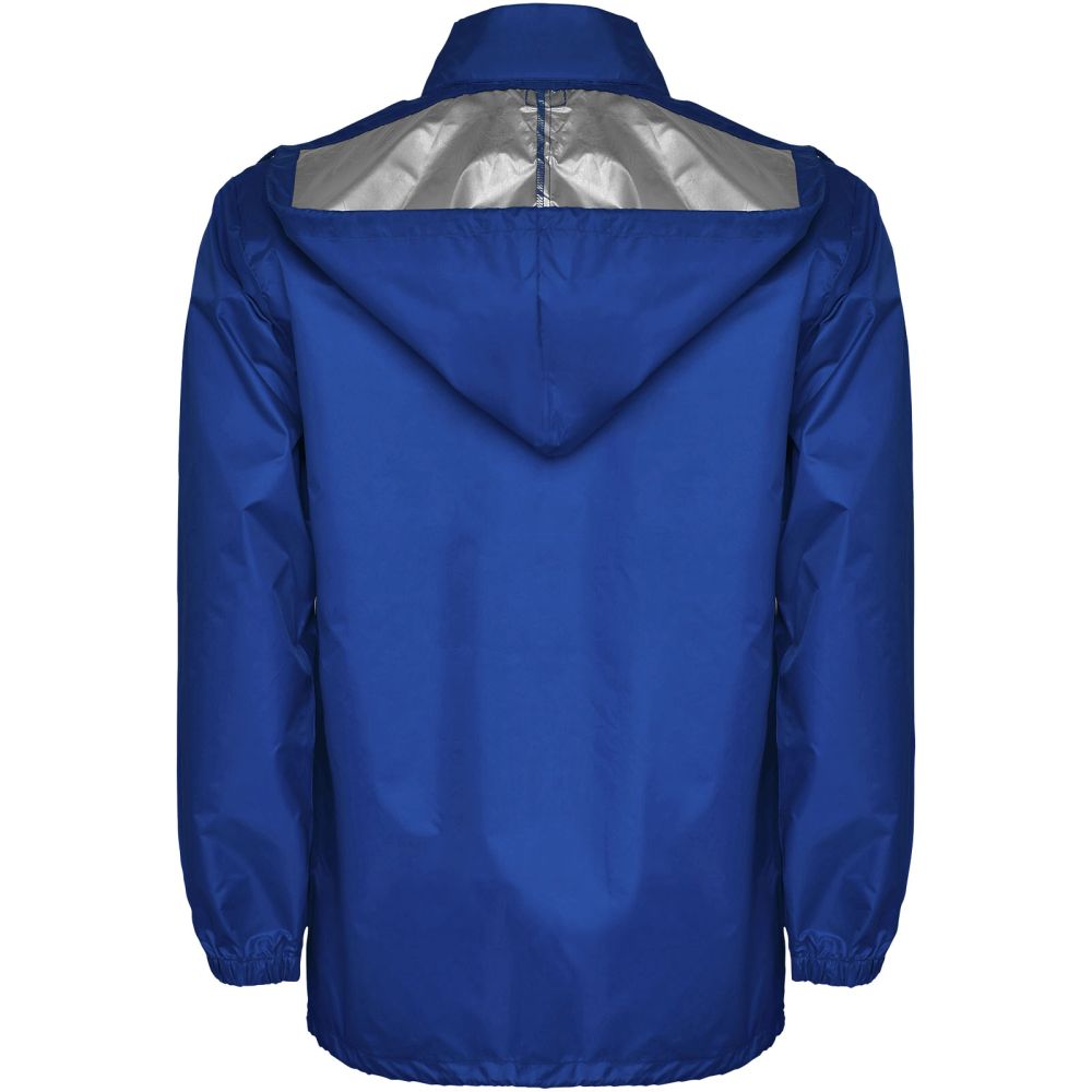 Nepromokavá pláštěnka. Vysoký výstřih a skládací kapuce s nastavitelnou šňůrkou. Přední zip s odpovídajícím taháčkem. Dvě boční kapsy s klopou. Elastické manžety. Elastický pásek uvnitř kapsy pro složení a uskladnění. Voděodolný model. Model měří 185 cm a má na sobě velikost L.