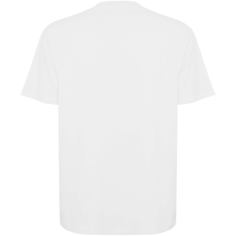 Tričko s krátkým rukávem v nadměrné velikosti. Kulatý límec zdobený 2×1 žebrovým úpletem se sladěnými kryty švů. Boční švy. Široké dvojité prošívání na rukávech a lemu. Odnímatelný štítek.