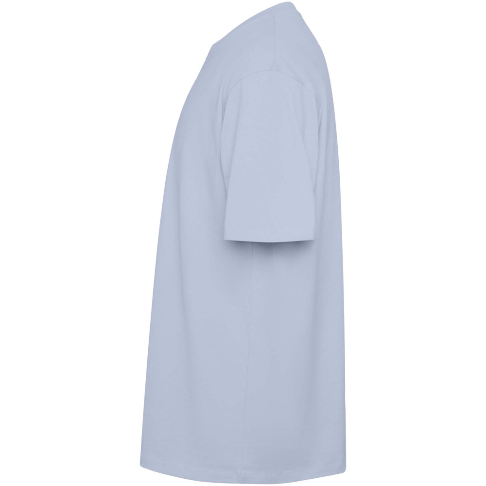 Tričko s krátkým rukávem v nadměrné velikosti. Kulatý límec zdobený 2×1 žebrovým úpletem se sladěnými kryty švů. Boční švy. Široké dvojité prošívání na rukávech a lemu. Odnímatelný štítek.