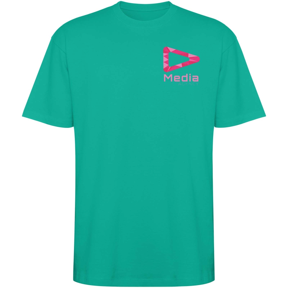 Tričko s krátkým rukávem v nadměrné velikosti. Kulatý límec zdobený 2×1 žebrovým úpletem se sladěnými kryty švů. Boční švy. Široké dvojité prošívání na rukávech a lemu. Odnímatelný štítek.