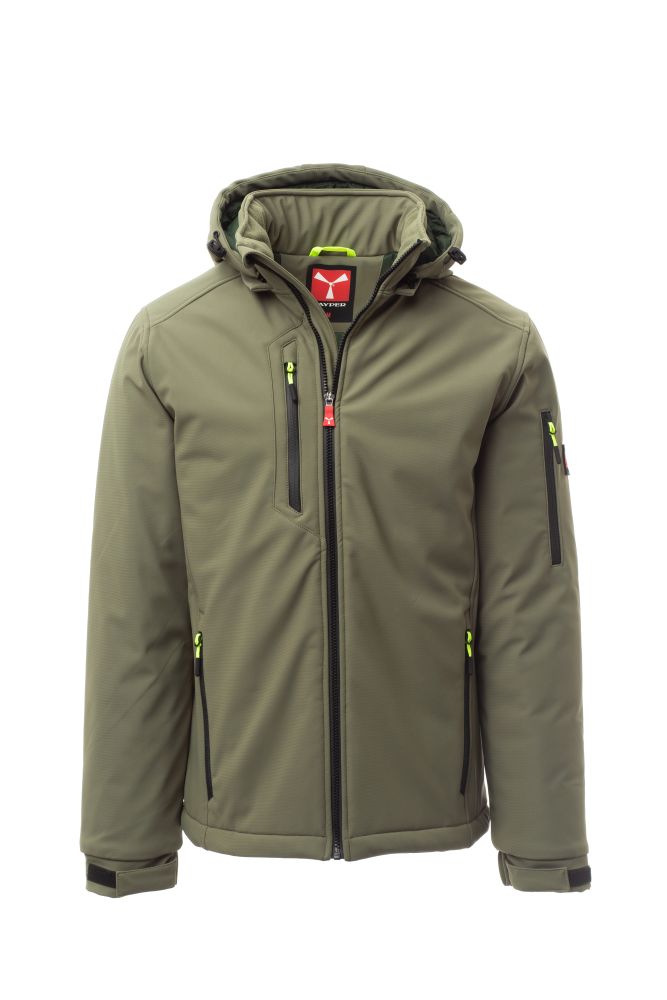 WP 8000 mm H2O, WVT 5000 g/m2 24h. Pánský zateplený softshell, zapínání na zip SBS s kovovým jezdcem „semi-auto lock“ a přizpůsobeným taháčkem. Odnímatelná kapuce se stahovací šňůrkou. Vnitřní límec s flísovými bočními prvky. Reflexní pruhy na zádech a zadní straně kapuce. Elastické stahovací manžety na suchý zip. Dvě boční kapsy na zip, jedna kapsa na hrudi s voděodolným zipem a jedna kapsa na levé paži s integrovaným očkem na pero na zip. Fluorescentní taháčky. Jedna vnitřní prostřižená kapsa na suchý zip. Spodní část stažitelná pomocí přizpůsobených zarážek.