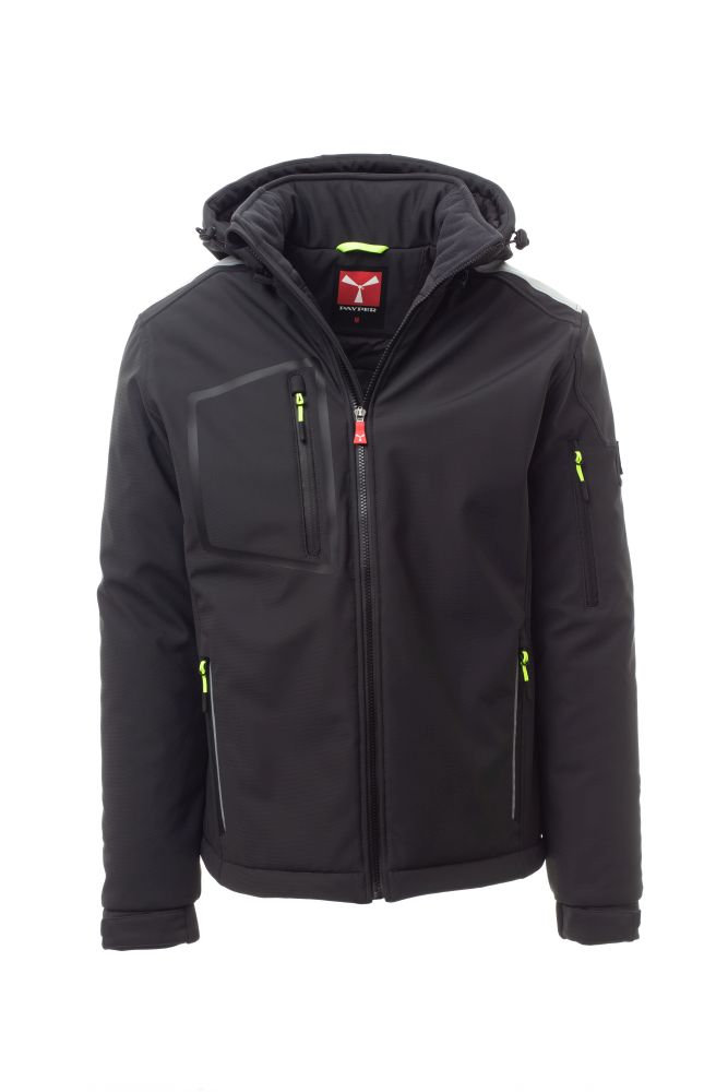 WP 8000 mm H2O, WVT 5000 g/m2 24h. Pánský zateplený softshell, zapínání na zip SBS s kovovým jezdcem „semi-auto lock“ a přizpůsobeným taháčkem. Odnímatelná kapuce se stahovací šňůrkou. Vnitřní límec s flísovými bočními prvky. Reflexní pruhy na ramenou, zádech a zadní straně kapuce. Elastické stahovací manžety na suchý zip a vnitřní návlek. Tepelně zatavená kapsa na hrudi s voděodolným zipem. Dvě boční kapsy na zip s reflexním prvkem. Jedna kapsa na levé paži s integrovaným očkem na pero na zip. Fluorescenční taháčky. Dvě vnitřní kapsy, jedna pravá tvarovaná na hrudi na zip a druhá na tablet na suchý zip. Spodní část stažitelná pomocí přizpůsobených zarážek.