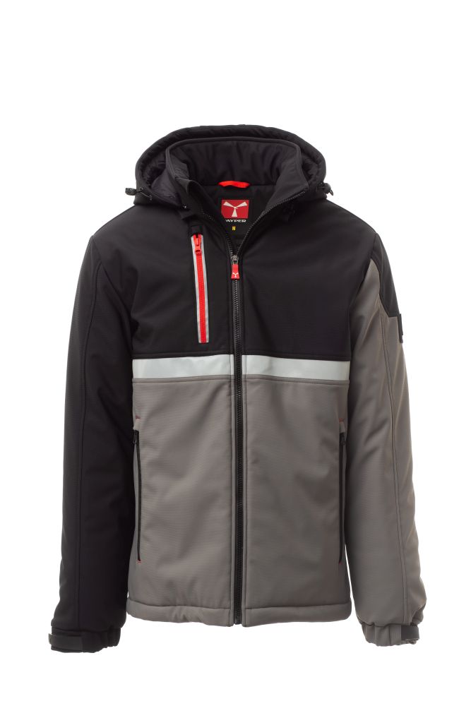 WP 8000 mm H2O, WVT 5000 g/m2 24h. Pánský zateplený softshell, zapínání na zip SBS s kovovým jezdcem „semi-auto lock“ a přizpůsobeným taháčkem. Odnímatelná kapuce se stahovací šňůrkou. Přední reflexní pruh na hrudi. Elastické stahovací manžety na suchý zip a vnitřní manžetka. Dvě boční kapsy na zip a jedna kapsa na hrudi na zip s reflexním prvkem. Prvek „life-saving“ na zadní straně, s vnitřním reflexním logem a zapínáním na zip. Dvě vnitřní kapsy: jedna tvarovaná na zip na pravé straně hrudi a jedna na tablet se zapínáním na suchý zip. Spodní část stažitelná pomocí přizpůsobených zarážek.