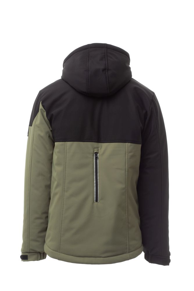 WP 8000 mm H2O, WVT 5000 g/m2 24h. Pánský zateplený softshell, zapínání na zip SBS s kovovým jezdcem „semi-auto lock“ a přizpůsobeným taháčkem. Odnímatelná kapuce se stahovací šňůrkou. Přední reflexní pruh na hrudi. Elastické stahovací manžety na suchý zip a vnitřní manžetka. Dvě boční kapsy na zip a jedna kapsa na hrudi na zip s reflexním prvkem. Prvek „life-saving“ na zadní straně, s vnitřním reflexním logem a zapínáním na zip. Dvě vnitřní kapsy: jedna tvarovaná na zip na pravé straně hrudi a jedna na tablet se zapínáním na suchý zip. Spodní část stažitelná pomocí přizpůsobených zarážek.