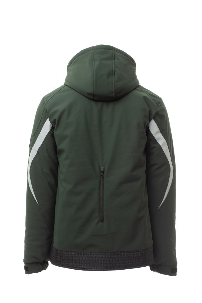 WP 8000 mm H2O, WVT 5000 g/m2 24h. Pánský zateplený softshell, zapínání na zip SBS s kovovým jezdcem „semi-auto lock“ a přizpůsobeným taháčkem. Odnímatelná kapuce se stahovací šňůrkou. Reflexní pruh na ramenou a pažích. Elastické stahovací manžety na suchý zip a s vnitřní manžetou. Kapsa na hrudi Lock System s klopou a očkem na pero. Dvě boční kapsy s voděodolným zipem. Prvek „life-saving“ na zadní straně, s vnitřním reflexním logem a voděodolným zipem. Dvě vnitřní kapsy, z nichž jedna na tablet se zapínáním na suchý zip a druhá tvarovaná na zip na pravé straně hrudi. Spodní část stažitelná pomocí přizpůsobených zarážek. Tečkovaná tkanina s reflexním efektem.