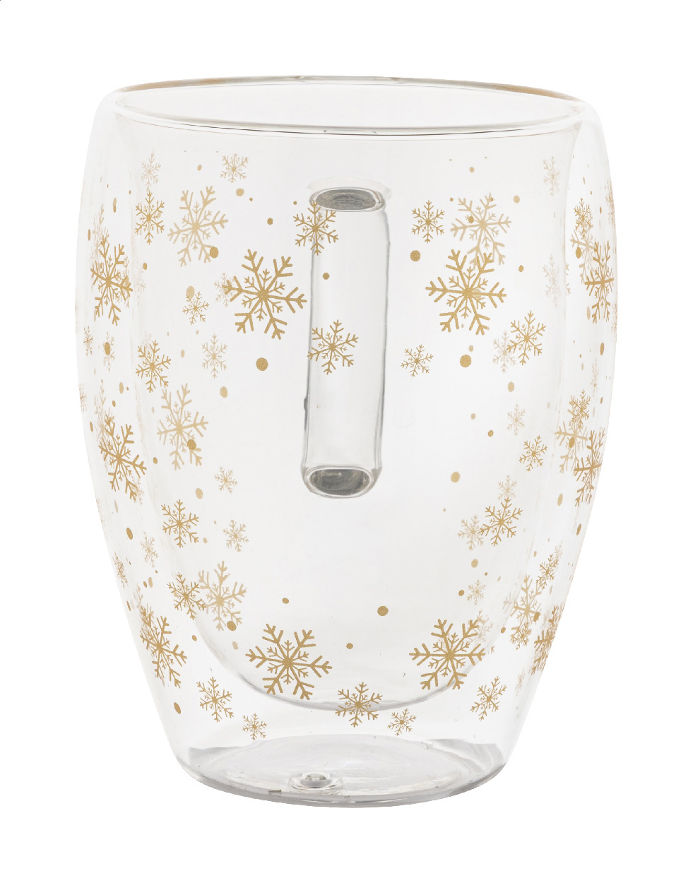 Dvoustěnný termohrnek z borosilikátového skla s motivem vánočních sněhových vloček, 350 ml. V krabičce z kraftového papíru. Rozměry: o 8,3 x 11,6 cm.
