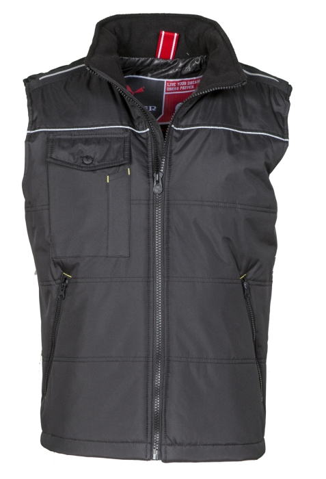 Prošívaná vesta s podšívkou a reflexním proužkem na hrudi a na zádech, kapsou na telefon na hrudi s přihrádkou na tužku, dvěma velkými kapsami na zip a vnitřní kapsou. Materiál: pongee 100% polyester, 175grm.