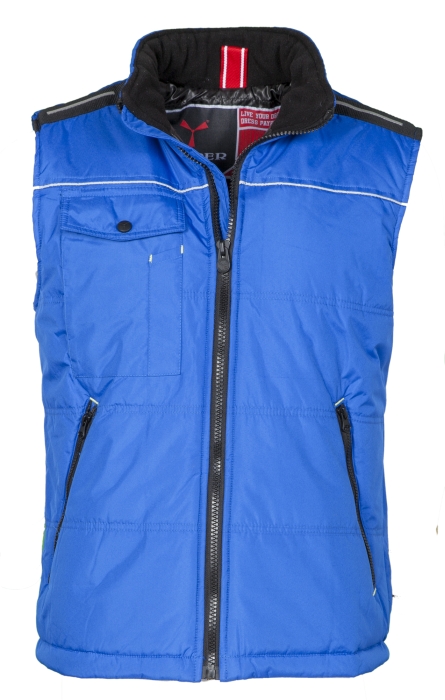 Prošívaná vesta s podšívkou a reflexním proužkem na hrudi a na zádech, kapsou na telefon na hrudi s přihrádkou na tužku, dvěma velkými kapsami na zip a vnitřní kapsou. Materiál: pongee 100% polyester, 175grm.