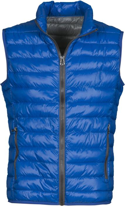 Pánská prošívaná vesta s šedou podšívkou, celopropínací, 2 vnější kapsy na zip, 2 vnitřní kapsy, 100% nylon s lesklou povrchovou úpravou, uvnitř polyester - imitace peří. Kovové zipy s pogumovaným povrchem. Doporučená technologie tisku: sítotisk S3, výšivka.