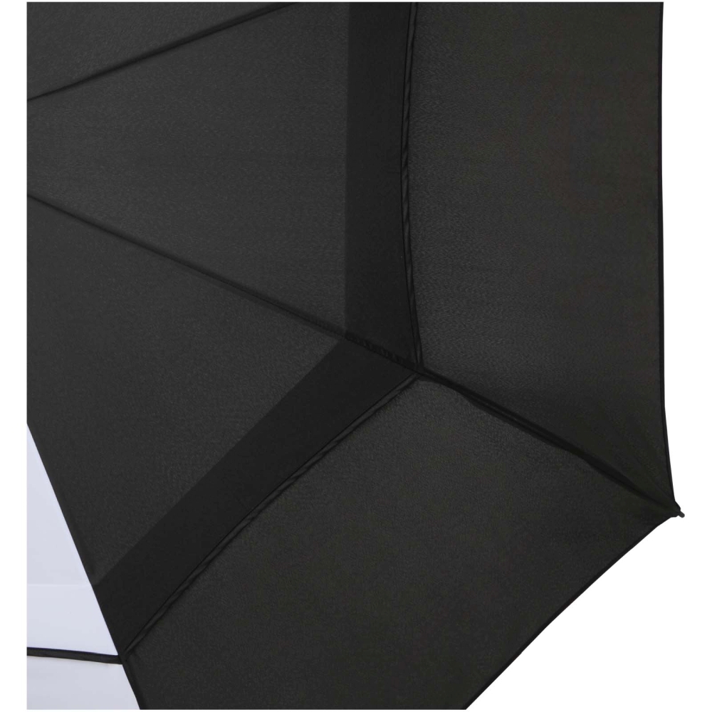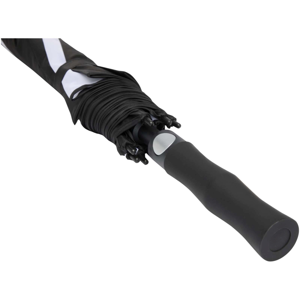 Větruodolný golfový deštník disponuje prostornou polyesterovou stříškou o šířce 140 cm, která pohodlně chrání více lidí před nepřízní počasí. Robustní laminátová tyč a rám poskytují vynikající flexibilitu a silnou odolnost vůči silnému větru. Praktická plastová rukojeť s tlačítkem pro automatické otevírání zajišťuje rychlé a snadné ovládání. Kontrastní panely stříšky představují perfektní příležitost pro výrazný a poutavý branding – ideální pro akce, reklamu nebo každodenní použití. Rozměry: 106 x 6 cm