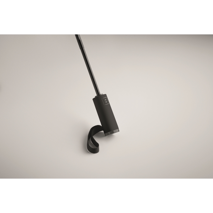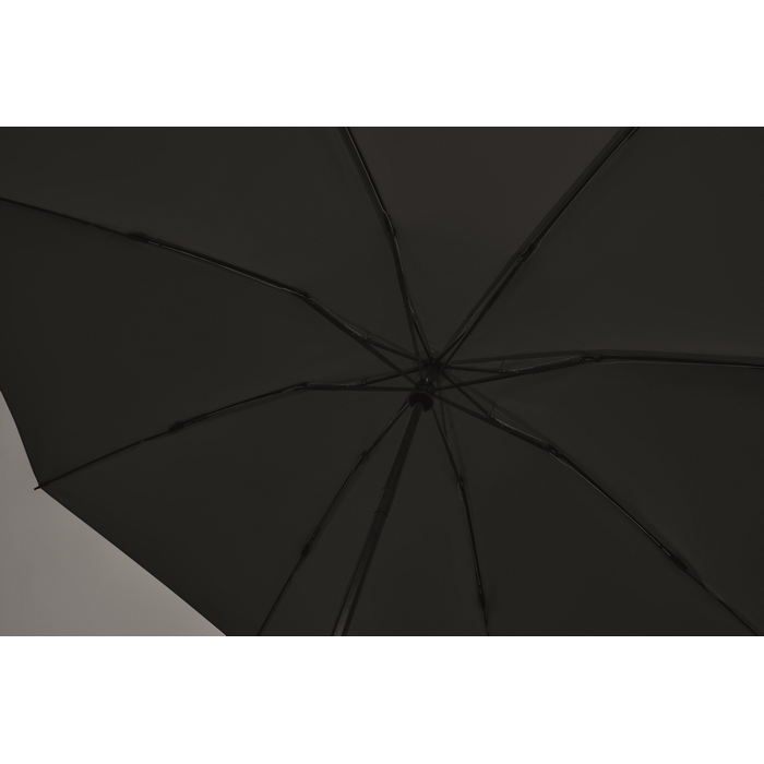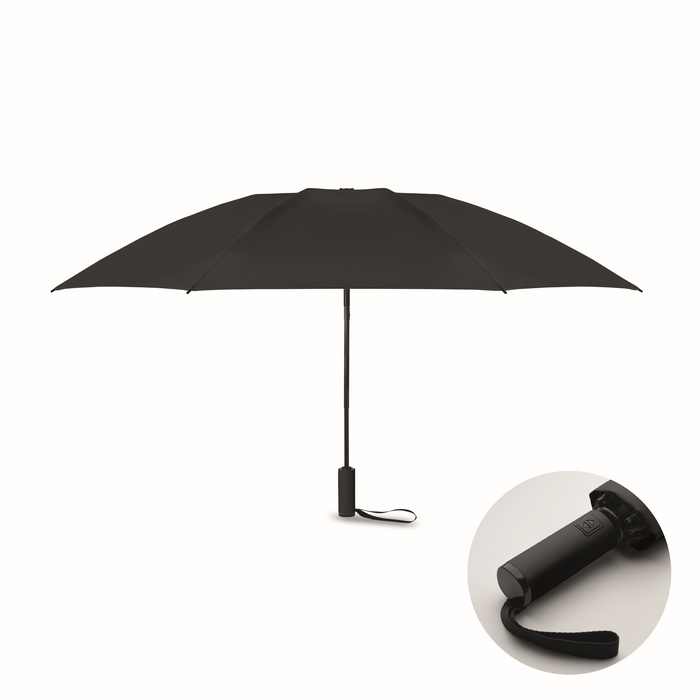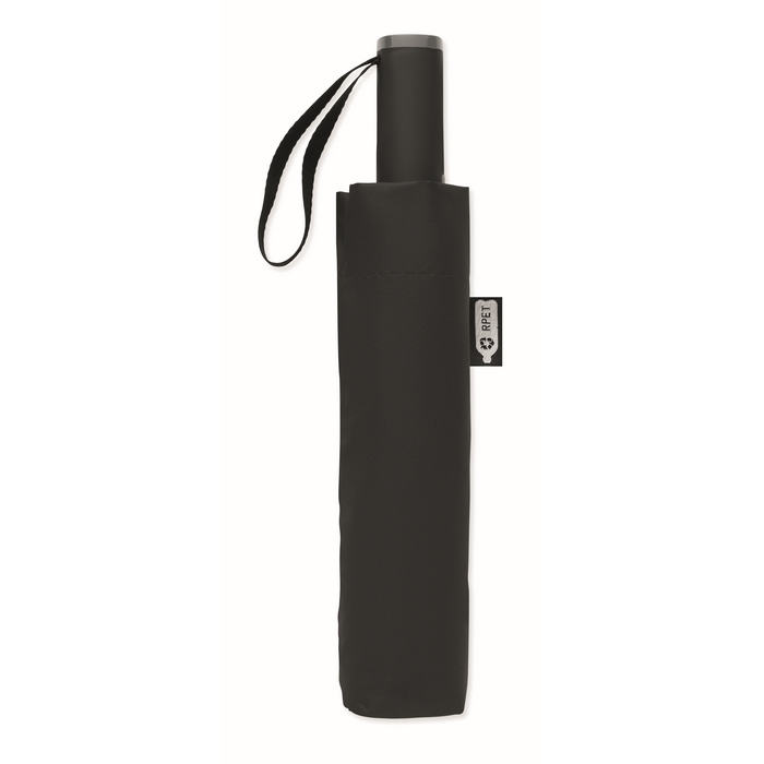 23palcový skládací větruodolný deštník ze 190T RPET pongee v obalu. Automatické otevírání a zavírání. Černá pokovená tyč, žebra ze sklolaminátu a rukojeť z ABS s gumovou povrchovou úpravou. Rozměry: O107 x 62 cm