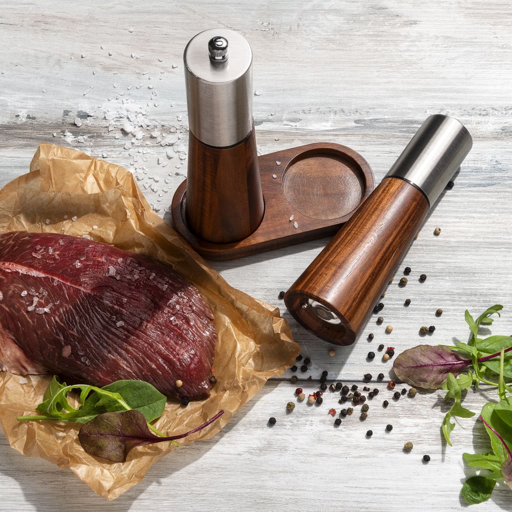 Elegantní sada mlýnků na pepř a sůl s dřevěným podstavcem značky Vanilla Season. Mlýnky jsou navrženy v kombinaci akáciového dřeva a nerezové oceli, což vytváří jejich nadčasový design. Mlecí kameny jsou keramické. Baleno v dárkové krabičce.