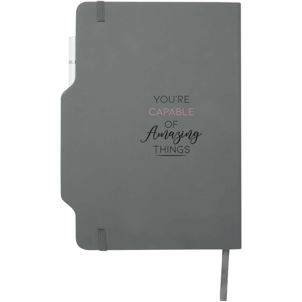 Zápisník A5 s pevnou obálkou s kombinací pera/tužky obsahuje 80 linkovaných listů papíru v krémové barvě o gramáži 70 g/m2, zaoblené rohy, elastické zavírání a záložku. Pero je dvouhlavé, kde na jedné straně je pero s černým inkoustem a na druhé straně tužka. Šířka psací stopy pera: 1000 metrů. Rozměr hrotu: 1,00 mm. Rozměry: 21 x 14,5 cm