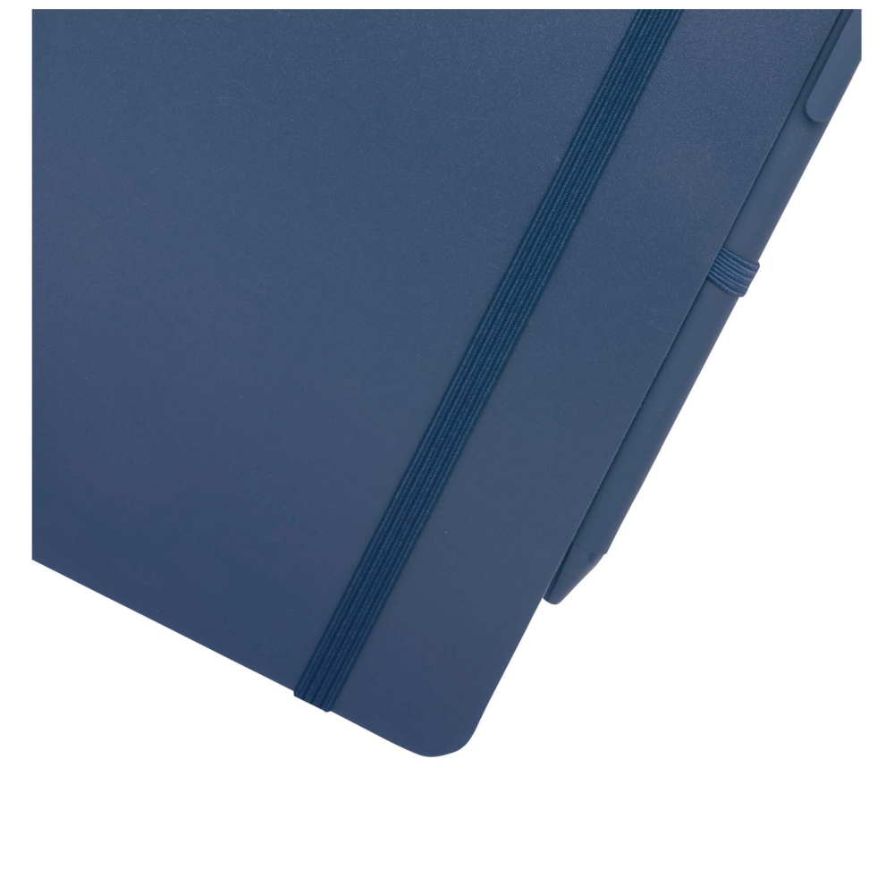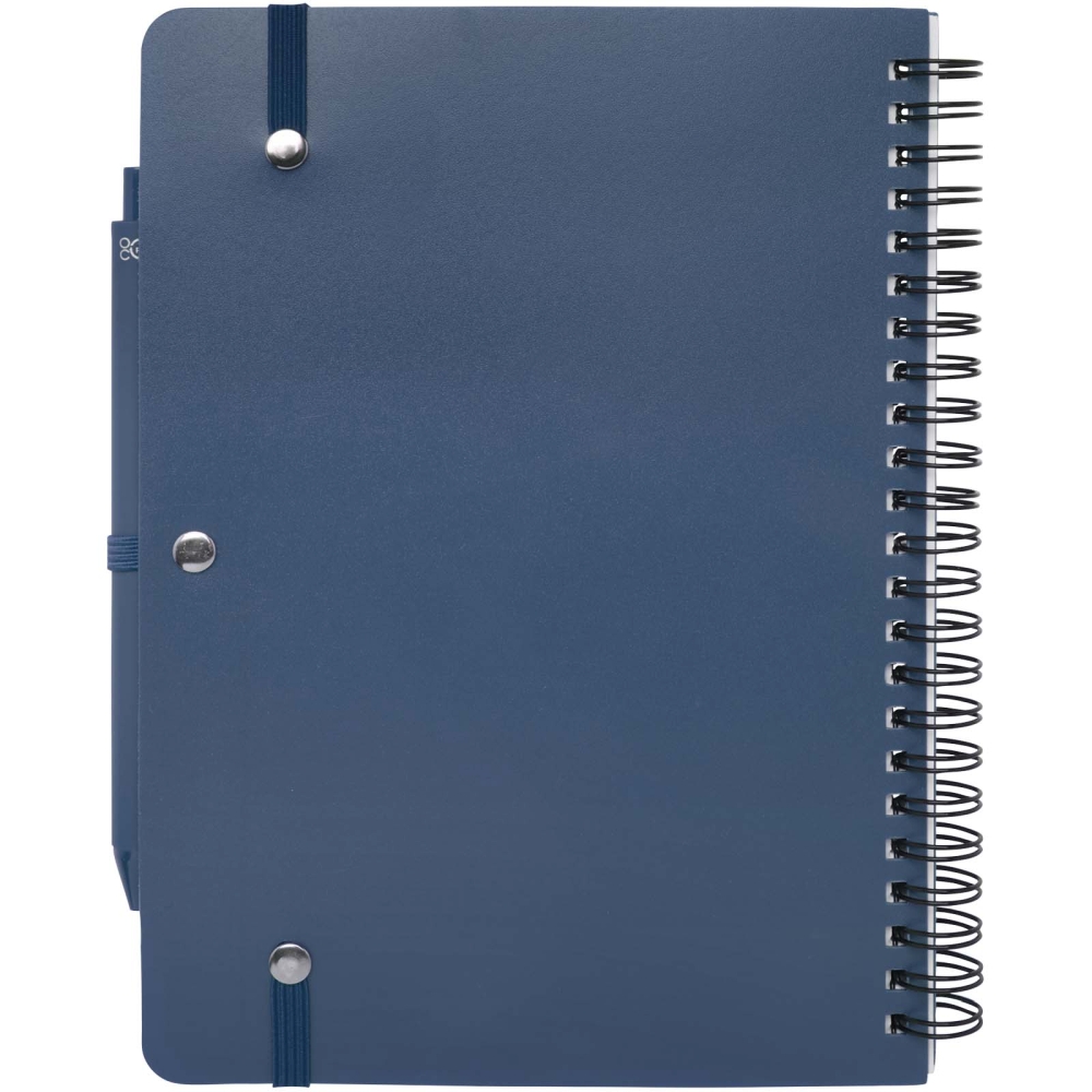 Zápisník formátu A5 s pevnou obálkou je vyroben z recyklovaného plastu, který by jinak skončil v oceánu, s 80 linkovanými listy papíru v krémové barvě o gramáži 70 g/m2. Zápisník má zaoblené rohy, elastické zavírání a poutko na pero. Propiska s černým inkoustem je také vyrobena z recyklovaného plastu z oceánu. Délka psaní: 1000 metrů. Rozměr hrotu: 1,0 mm. Rozměry: 21 x 14,5 cm