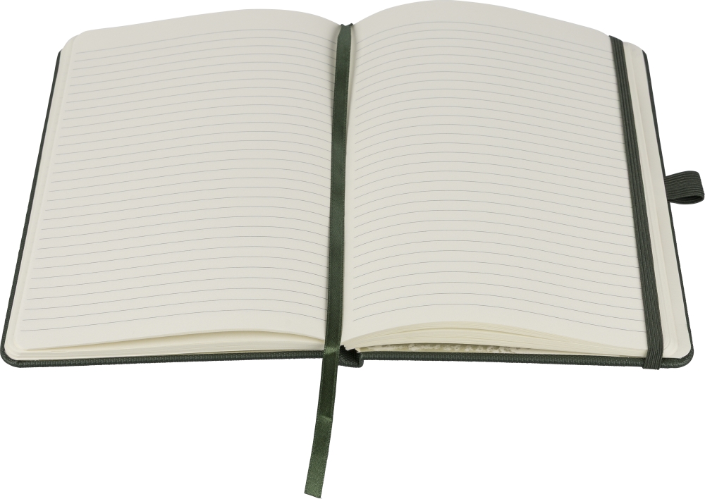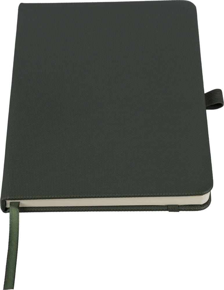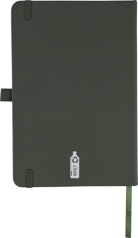Polyesterový zápisník rPET 600D s PU povrchovou úpravou, formát papíru A5. Obsahuje 80 listů linkovaného papíru o gramáži 70 g/m2 a je vybaven záložkou se stuhou, gumičkou a poutkem na pero. Polotvrdá vazba. Na zadní straně je vyražené recyklované logo. Rozměry: 21 cm x 14,8 cm