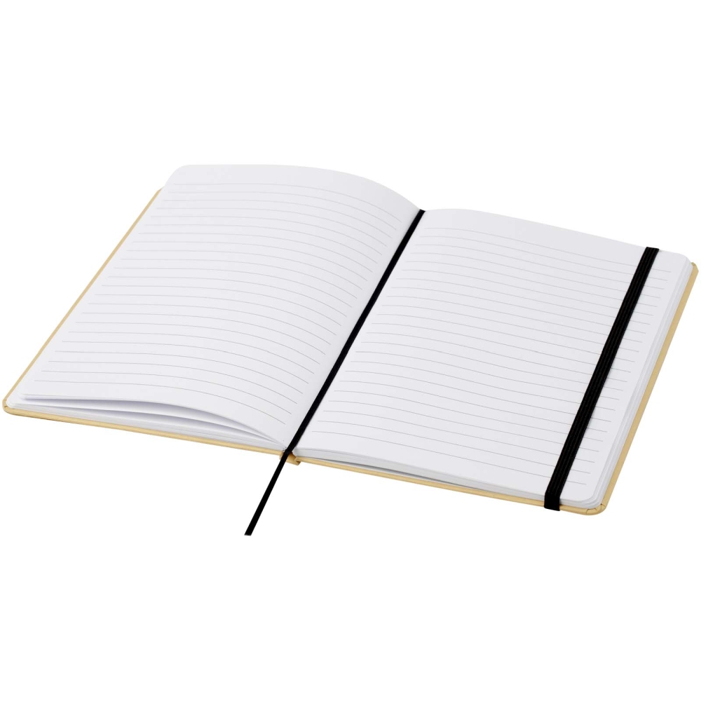 Zápisník formátu A5 s pevnou vazbou vyrobený z recyklované lepenky s 80 linkovanými listy papíru o gramáži 70 g/m2. Zápisník má elastické zapínání, stuhu a zaoblené rohy. Rozměry: 21 x 14,5 cm